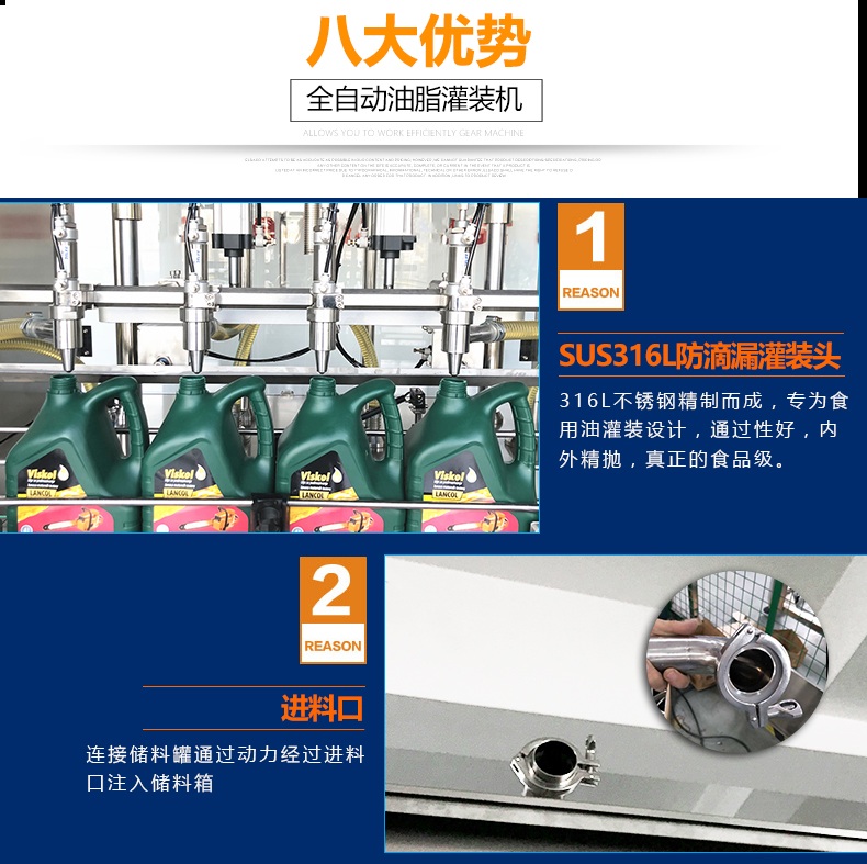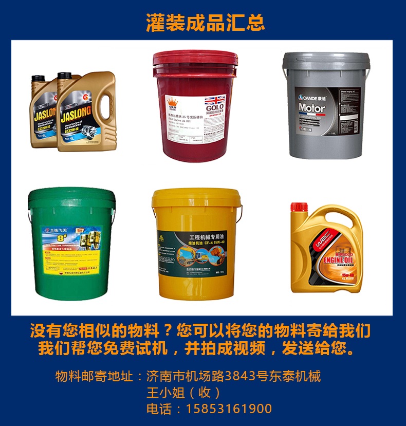 本機(jī)是根據(jù)潤滑油的特性而設(shè)計(jì)的一款全自動稱重式潤滑油灌裝機(jī),該機(jī)設(shè)計(jì)緊湊合理,外形簡潔美觀大氣,灌裝量調(diào)節(jié)方便,精度高,借鑒灌裝流程控制技術(shù),進(jìn)口彩色觸摸屏人機(jī)界面,灌裝進(jìn)程實(shí)現(xiàn)一鍵式操作,性能穩(wěn)定。采用兩個316儲油箱解決灌裝量大的問題,一個進(jìn)油口控制兩個油箱的液位,一個儲油罐分別控制5個灌裝頭,速度更快,精度更高。