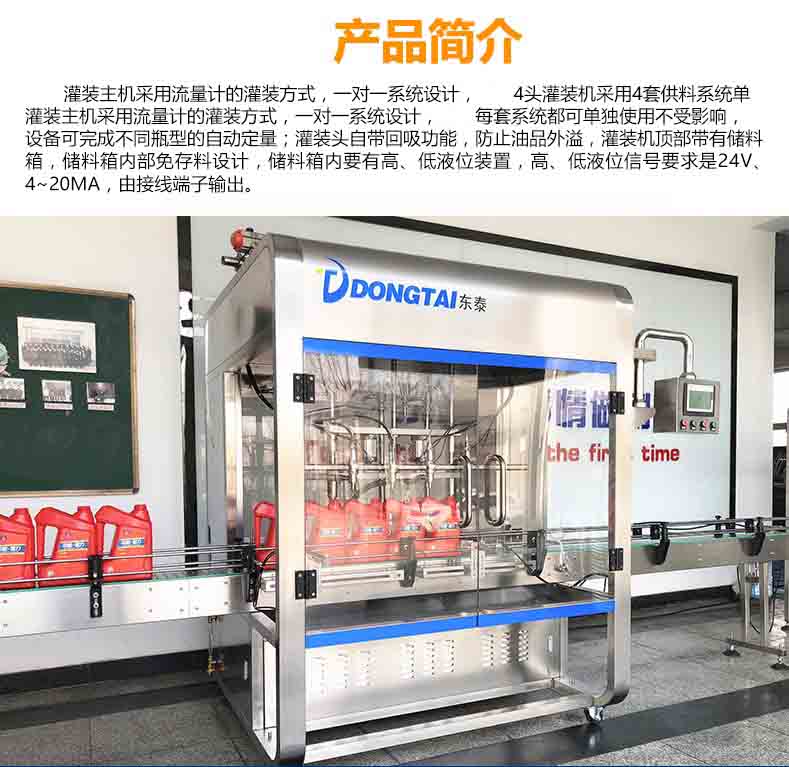 全自動潤滑油灌裝主機采用流量計的灌裝方式,一對一系統(tǒng)設計,4頭灌裝機采用4套供料系統(tǒng)單灌裝主機采用流量計的灌裝方式