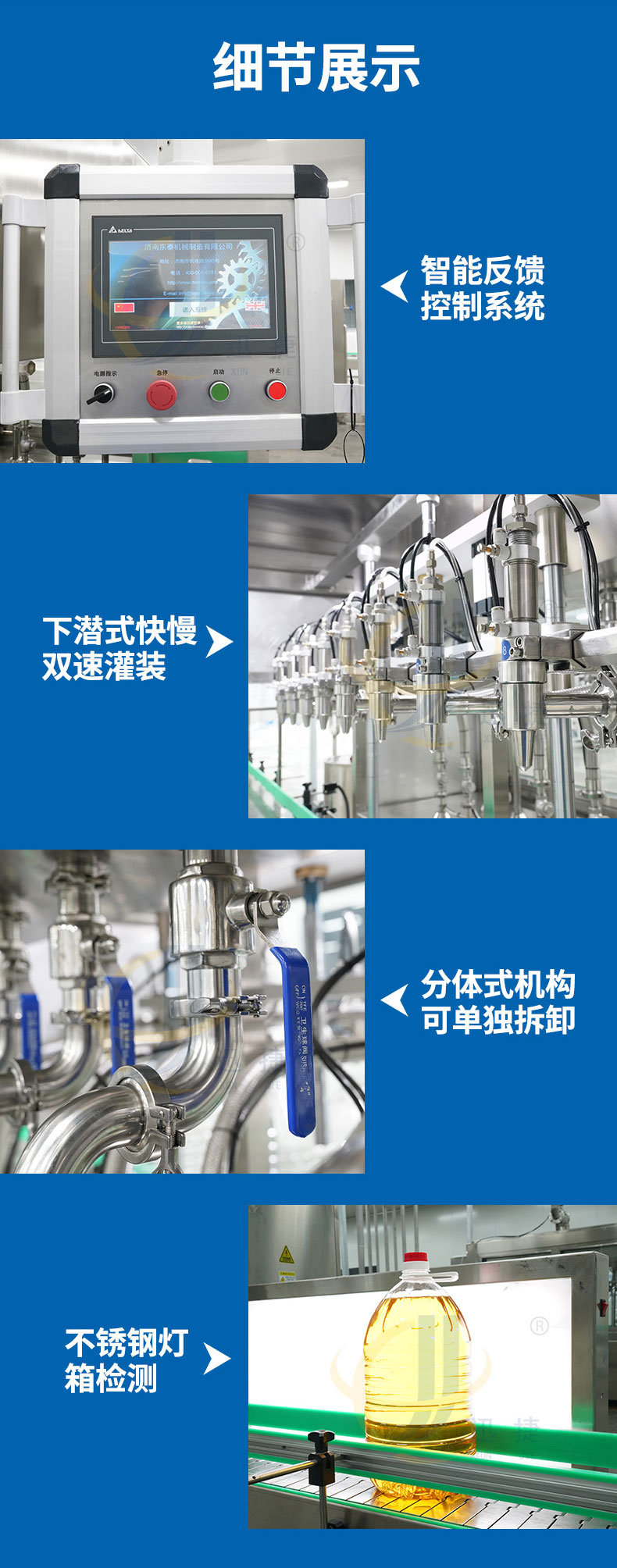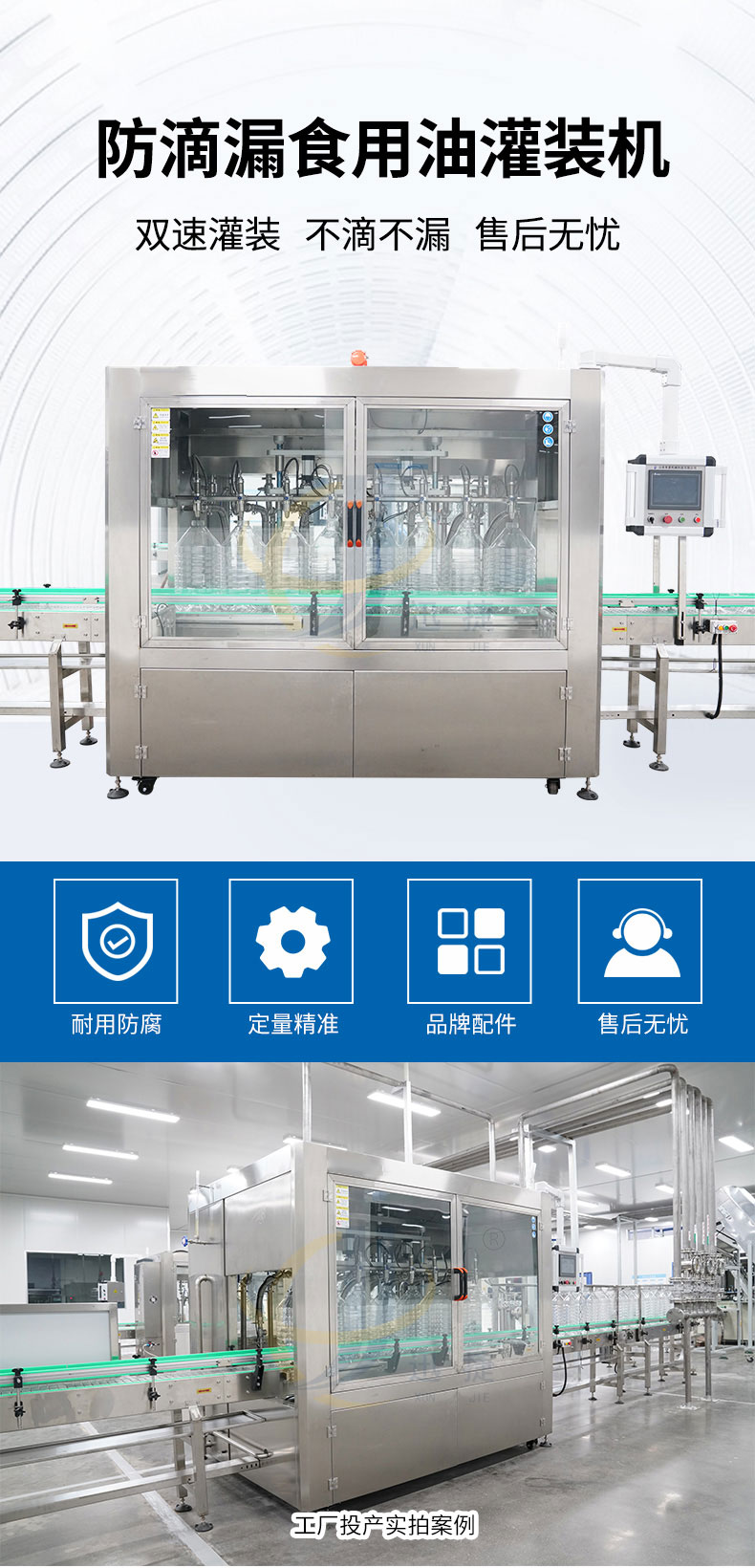 全自動(dòng)八頭食用油灌裝機(jī)單頭單泵單變頻控制,容積和質(zhì)量?jī)煞N計(jì)量方式自由轉(zhuǎn)換,灌裝調(diào)節(jié)方便快捷。