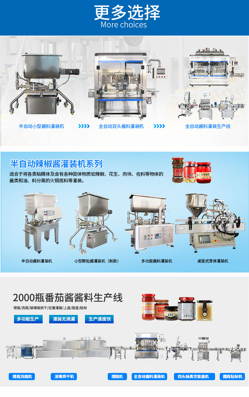 全自動(dòng)四頭辣椒醬灌裝機(jī)適合中小口徑三旋、四旋玻璃瓶調(diào)味醬的分裝,適合醬料、含顆粒黏稠物料的灌裝,物料接觸部分均采用