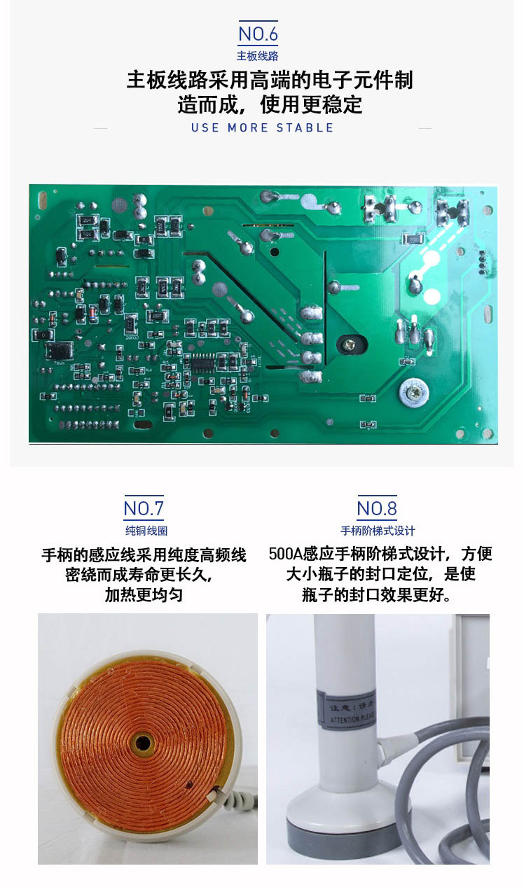 本機采用國外先進線路,選用日本新模塊化功率器件,較于一般電子感應(yīng)加熱器更省電,熱效率達到90%以上,瞬時加熱速度為后者的20-30倍,因此不僅 適用于熱封性能較好的聚乙烯、聚丙烯材質(zhì)的瓶體,而且對熱封性能較差的聚酯瓶、玻璃瓶也有極好的封口效果。